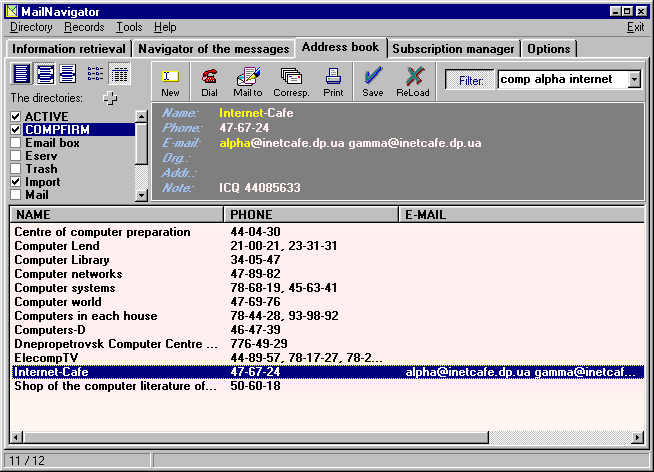 Information in the address book is grouped into directories, which, just like the mail files in the message navigator, could be selected for review simultaneously.