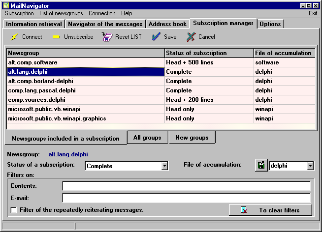 The subscription manager of the program is a very convenient tool for subscribing to newsgroups.